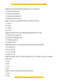 ể ốt cháy 4,48 lít khí etilen là A. 4,48 lít B. 8,96 lít C. 13,44 lít D. 6,72 lít Câu 8. Số th t ứ chu kì ự trong b ng h ả t ệ h ng t ố u n hoàn cho bi ầ t ế A. Số th t ứ c ự a ủ nguyên tố B. Số electron l p ngoài ớ cùng C. Số hi u nguyên t ệ ử D. Số l p el ớ ectron Câu 9. S p ắ x p nào s ế au đây đúng theo chi u t ề ính kim lo i ạ gi m ả d n: ầ A. Na, Mg, Al, K B. K, Na, Mg, Al C. Al, K, Na, Mg D. Mg, K, Al, Na