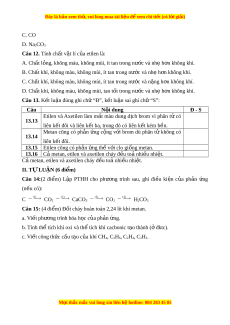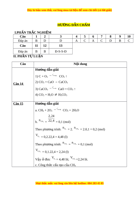ệ đ xe ể m chi ti t (c ế ó lời gi i ả ) HƯ N Ớ G DẪN CHẤM I.PHẦN TRẮC NGHI M Ệ Câu 1 2 3 4 5 6 7 8 9 10 Đáp án B D D A C A C D B C Câu 11 12 13 Đáp án B B Đ-S-S-Đ II. PHẦN T L Ự UẬN Câu N i ộ dung Hư ng ớ d n gi ẫ i ả 1) C + O2 t CO2 ↑ C âu 14 2) CO2 + CaO → CaCO3 o 3) CaCO t 3 CaO + CO2 ↑ 4) CO2 + H2O H ⇄ 2CO3 C âu 15 Hư ng ớ d n gi ẫ i ả a. CH4 + 2O2 t CO2 + 2H2O 2,24 n b. CH 22,4 4 = = 0,1 (mol) n n Theo phư ng