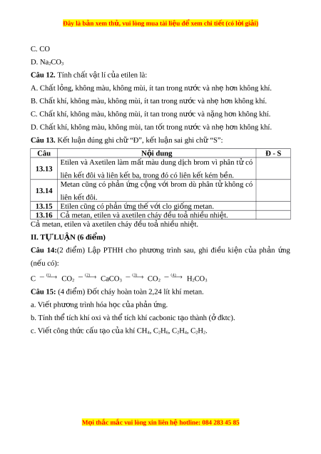 ệ đ xe ể m chi ti t (c ế ó lời gi i ả ) C. CO D. Na2CO3 Câu 12. Tính ch t ấ v t ậ lí c a et ủ ilen là: A. Chất l ng, o