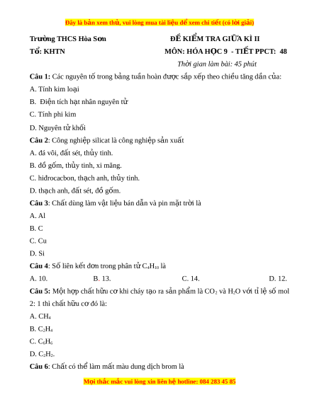 ệ đ xe ể m chi ti t ế (có l i ờ gi i ả ) Trư ng ờ THCS Hòa S n ơ ĐỀ KIỂM TRA GI A Ữ KÌ II T : ổ KHTN MÔN: HÓA H C Ọ 9 - TI T Ế PPCT: 48 Th i