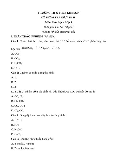 - Đề thi giữa kì 2 môn Hóa lớp 9 trường THCS Kim Sơn năm 2023 có đáp án.