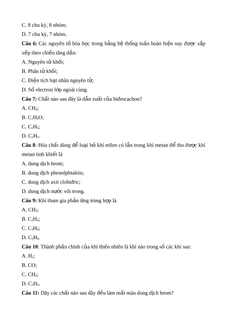 Câu 7: Chất nào sau đây là d n xu ẫ t ấ c a ủ hiđrocacbon? A. CH4; B. C2H6O; C. C2H4; D. C2H2. Câu 8: Hóa ch t ấ dùng để lo i ạ bỏ khí etilen có l n ẫ trong khí metan đ ể thu đư c ợ khí metan tinh khi t ế là A. dung dịch brom; B. dung d ch ị phenolphtalein; C. dung d ch ị axit clohiđric; D. dung dịch nư c ớ vôi trong.
