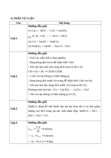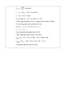 ể ) Đốt cháy 6 gam ch t ấ h u ữ cơ A thu đư c ợ 17,6 gam CO2 và 10,8 gam H2O. a. Trong chất h u c ữ ơ A có nh ng ữ nguyên tố nào? b. Bi t ế tỉ khối h i ơ c a ủ A đối v i ớ H2 b ng 15. ằ Tìm công th c ứ phân t c ử a ủ A. HƯ N Ớ G DẪN CHẤM I.PHẦN TRẮC NGHI M Ệ Câu 1 2 3 4 5 6 7 8 9 10 Đáp án D C A B B C B A B C Câu 11 12 Đáp án D D II. PHẦN T L Ự UẬN Câu N i ộ dung Hư ng ớ d n gi ẫ i ả