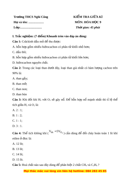 - Đề thi giữa kì 2 môn Hóa lớp 9 trường THCS Nghi Công năm 2023 có đáp án.