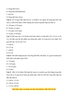 Câu 8: Tính khối lư ng benzen ợ c n dùng đ ầ đi ể u ch ề đ ế ư c ợ 31,4 gam brombenzen? Bi t ế hiệu suất ph n ả ng l ứ à 85%. A. 15,6 gam; B. 13,26 gam; C. 18,353 gam; D. 32 gam.