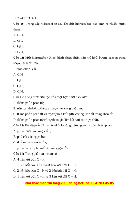 ố hiđrocacbon nào sinh ra nhi u ề mu i ộ than? A. C2H6; B. CH4; C. C2H4; D. C6H6. Câu 11: M t