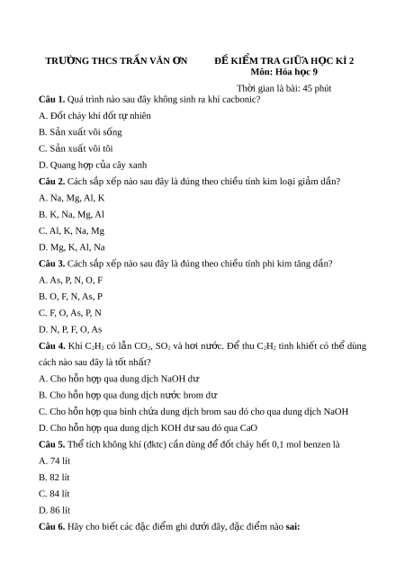 - Đề thi giữa kì 2 môn Hóa lớp 9 trường THCS Trần Văn Ơn năm 2023 có đáp án.