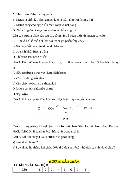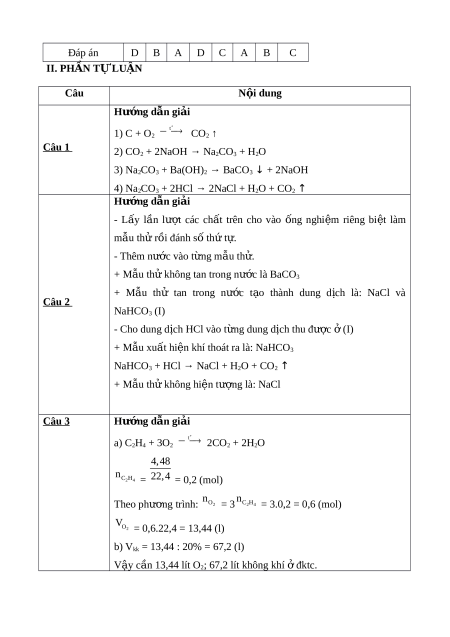 b) Bao nhiêu lít không khí ch a ứ 20% th t ể ích oxi (bi t ế th t ể ích các khí đo đkt ở c)? HƯ N Ớ G DẪN CHẤM I.PHẦN TRẮC NGHI M Ệ Câu 1 2 3 4 5 6 7 8 Đáp án D B A D C A B C II. PHẦN T L Ự UẬN Câu N i ộ dung Hư ng ớ d n gi ẫ i ả 1) C + O2 t CO2 ↑ C âu 1