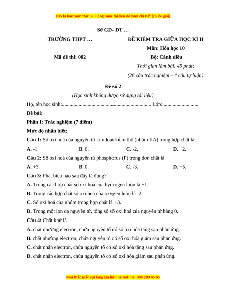 ĐỀ KIỂM TRA GIỮA HỌC KÌ II Môn: Hóa học 10 Mã đề thi: 002 Bộ: Cánh diều