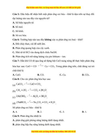 Câu 5: Dấu hiệu để nhận biết một phản ứng oxi hóa – khử là dựa trên sự thay đổi