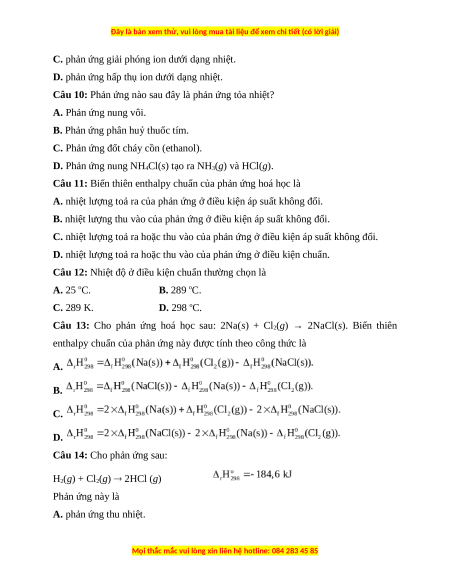 Câu 11: Biến thiên enthalpy chuẩn của phản ứng hoá học là