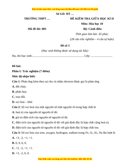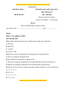 ĐỀ KIỂM TRA GIỮA HỌC KÌ II Môn: Hóa học 10 Mã đề thi: 003 Bộ: Cánh diều