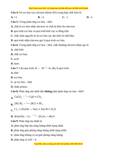 Câu 8: Phản ứng nào dưới đây không phải phản ứng oxi hoá - khử?