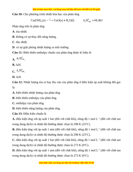 Câu 11: Biến thiên enthalpy chuẩn của phản ứng được kí hiệu là