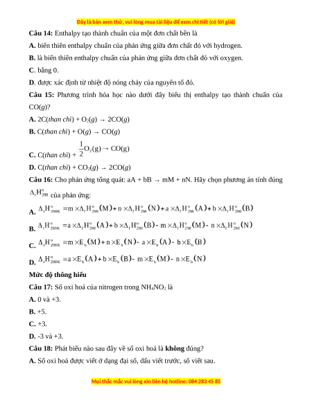 Câu 14: Enthalpy tạo thành chuẩn của một đơn chất bền là