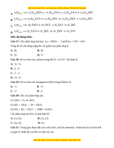 Câu 10: Enthalpy tạo thành chuẩn (nhiệt tạo thành chuẩn) của một chất có kí hiệu là A. B. C. ∆S. D. ∆T.
