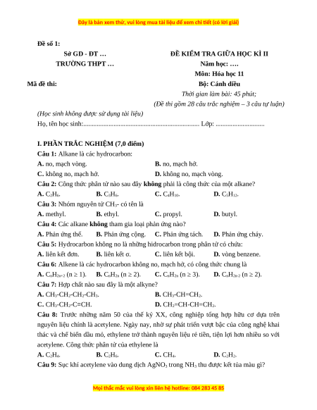 ĐỀ KIỂM TRA GIỮA HỌC KÌ II TRƯỜNG THPT … Năm học: …. Môn: Hóa học 11 Mã đề thi: Bộ: Cánh diều