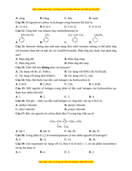 Câu 10: Số nguyên tử carbon và hydrogen trong benzene lần lượt là A. 12 và 6. B. 6 và 6. C. 6 và 12. C. 6 và 14.