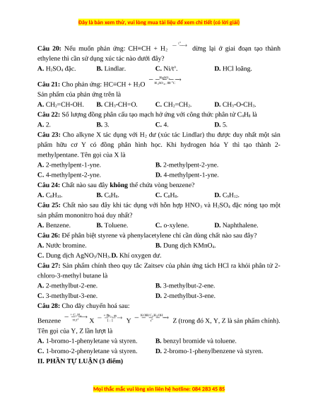 Câu 23: Cho alkyne X tác dụng với H2 dư (xúc tác Lindlar) thu được duy nhất một sản
