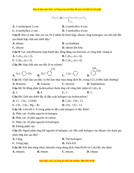 Câu 8: Khi có mặt chất xúc tác Ni ở nhiệt độ thích hợp, alkene cộng hydrogen vào liên kết đôi