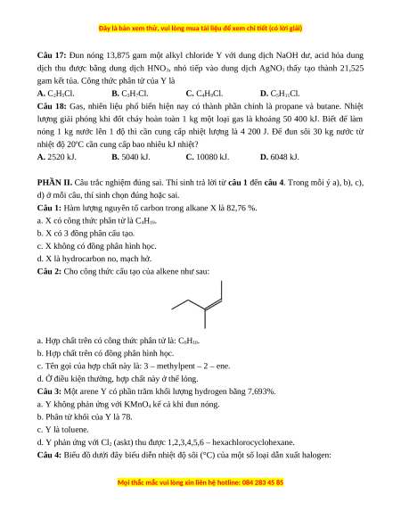 Câu 17: Đun nóng 13,875 gam một alkyl chloride Y với dung dịch NaOH dư, acid hóa dung