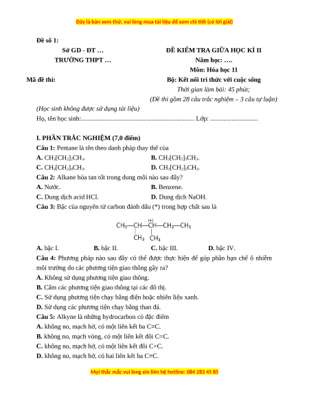 ĐỀ KIỂM TRA GIỮA HỌC KÌ II TRƯỜNG THPT … Năm học: …. Môn: Hóa học 11 Mã đề thi: