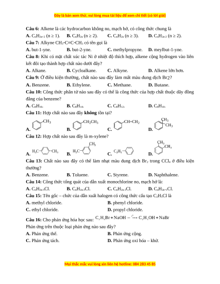 Câu 10: Công thức phân tử nào sau đây có thể là công thức của hợp chất thuộc dãy đồng đẳng của benzene? A. C8H16. B. C8H14. C. C8H12. D. C8H10.
