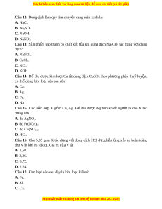 Câu 12: Dung dịch làm quỳ tím chuy n s ể ang màu xanh là: A. NaCl. B. Na2SO4. C. NaOH. D. NaNO3. Câu 13: S n ả ph m ẩ t o ạ thành có ch t ấ k t ế t a ủ khi dung d ch ị Na2CO3 tác d ng ụ v i ớ dung dịch: A. NaNO3. B. CaCl2. C. KCl. D. KOH.