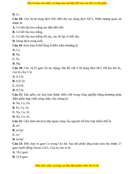 D. Dung dịch trong suốt. Câu 19: Kim lo i ạ t ở h l ể ng ỏ đi ở u ki ề n t ệ hư ng l ờ à: A. Cu. B. Na. C. Fe. D. Hg.