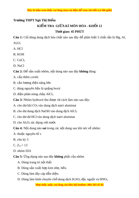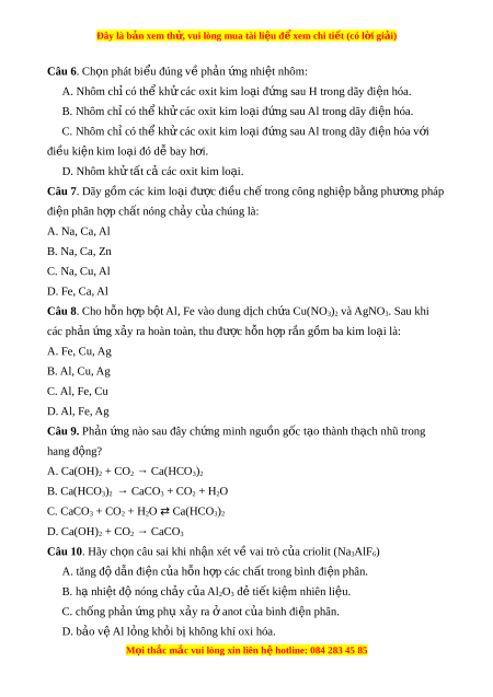Đây là bản xem th , vu ử i lòng mua tài li u ệ đ xe ể m chi ti t ế (có l i ờ gi i ả ) Câu 6. Ch n ọ phát bi u đúng v ể ph ề n ả ng nhi ứ t ệ nhôm: A. Nhôm ch có t ỉ hể kh các oxi ử t kim lo i ạ đ ng s ứ au H trong dãy đi n hóa. ệ B. Nhôm ch có t ỉ h kh ể các ử oxit kim lo i ạ đ ng s ứ au Al trong dãy đi n hóa. ệ C. Nhôm ch có t ỉ h kh ể các ử oxit kim lo i ạ đ ng s ứ au Al trong dãy đi n hóa v ệ i ớ đi u ki ề ện kim lo i ạ đó d bay ễ h i ơ .