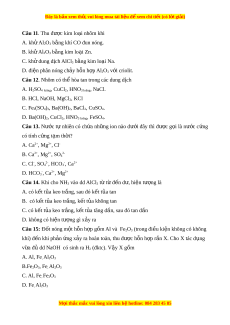 Câu 1: Chỉ dùng dung d ch ị hóa ch t ấ nào sau đây đ ể phân bi t ệ 3 ch t ấ r n ắ là Mg, Al, Al2O3 A. HCl B. KOH C. CuCl2 D. NaCl Câu 2: Đ s ể n xu ả ất nhôm, n i