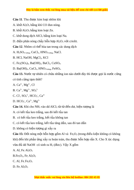 Đây là bản xem th , vu ử i lòng mua tài li u ệ đ xe ể m chi ti t ế (có l i ờ gi i ả ) Câu 11. Thu đư c ợ kim lo i ạ nhôm khi A. khử Al2O3 b ng khí ằ CO đun nóng. B. kh ử Al2O3 b ng ằ kim lo i ạ Zn. C. kh dung d ử ch ị AlCl3 b ng ki ằ m lo i ạ Na. D. điện phân nóng ch y ả h n h ỗ p ợ Al2O3 v i ớ criolit.