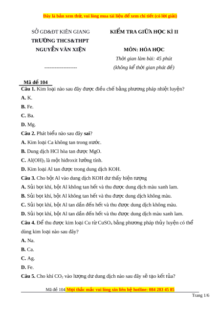 ờ gian làm bài: 45 phút ------------------- (không k t ể h i ờ gian phát đ ) ề Mã đ 104 ề Câu 1. Kim lo i ạ nào sau đây đư c đi ợ u ch ề ế b ng ph ằ ư ng pháp ơ nhi t ệ luy n? ệ A. K. B. Fe. C. Ba. D. Mg.