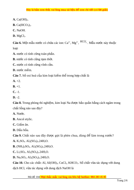Đây là bản xem th , vu ử i lòng mua tài li u ệ đ xe ể m chi ti t ế (có l i ờ gi i ả ) A. Ca(OH)2. B. Ca(HCO3)2. C. NaOH. D. MgCl2. Câu 6. M t ộ mẫu nư c có ch ớ a