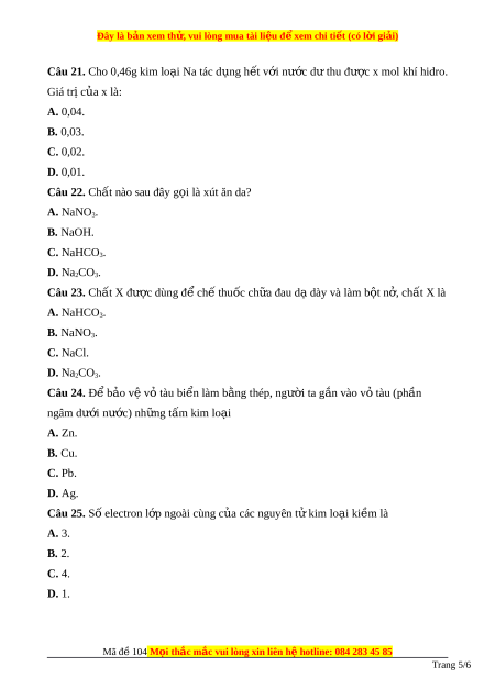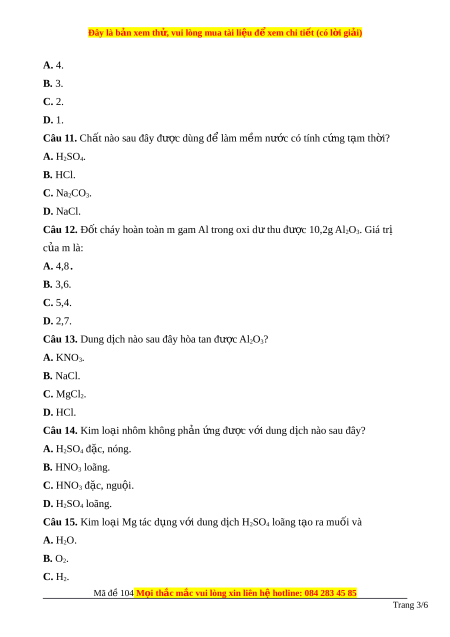Đây là bản xem th , vu ử i lòng mua tài li u ệ đ xe ể m chi ti t ế (có l i ờ gi i ả ) A. 4. B. 3. C. 2. D. 1. Câu 11. Ch t ấ nào sau đây đư c ợ dùng đ l ể àm m m ề nư c ớ có tính c ng ứ t m ạ th i ờ ? A. H2SO4. B. HCl. C. Na2CO3. D. NaCl.