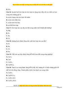 C. sự ăn mòn hoá h c. ọ D. sự kh ki ử m lo i ạ . Câu 17. Kim lo i ạ nào sau đây tan h t ế trong nư c ớ d ư nhi ở t ệ đ t ộ hư ng? ờ A. Mg. B. Fe. C. Ba. D. Al. Câu 18. Qu ng ặ boxit đư c dùng s ợ n xu ả t ấ kim lo i ạ nào sau đây? A. Fe. B. Ba. C. Al. D. Na.