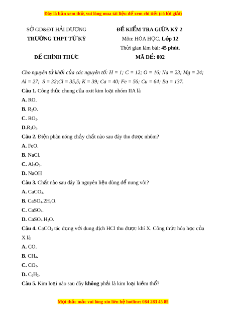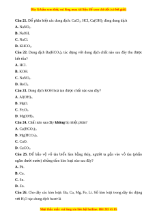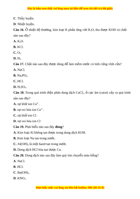 Đây là bản xem th , vu ử i lòng mua tài li u ệ đ xe ể m chi ti t ế (có l i ờ gi i ả ) C. Th y l ủ uyện. D. Nhi t ệ luy n. ệ Câu 16. Ở nhi t ệ độ thư ng, ờ kim lo i ạ K ph n ả ng ứ v i ớ H2O, thu đư c ợ KOH và ch t ấ nào sau đây? A. K2O. B. KCl. C. O2. D. H2. Câu 17. Ch t ấ nào sau đây đư c ợ dùng đ l ể àm m m ề nư c ớ có tính c ng ứ vĩnh c u? ử A. NaCl. B. Na3PO4. C. HCl. D. H2SO4.
