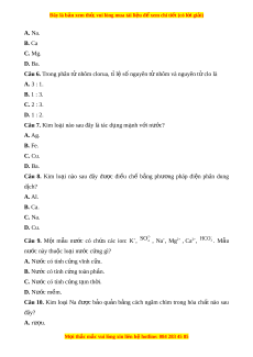 ạ nào sau đây là tác d ng m ụ nh v ạ i ớ nư c? ớ A. Ag. B. Fe. C. Cu. D. Ba. Câu 8. Kim lo i ạ nào sau đây đư c ợ đi u ề chế b ng ằ phư ng ơ pháp đi n ệ phân dung dịch? A. Al. B. Ca. C. Na. D. Cu. 2 Câu 9. M t ộ m u ẫ nư c ớ có ch a ứ các ion: K+, SO HCO 4 , Na+, Mg2+ , Ca2+, 3 . M u ẫ nư c ớ này thu c l ộ o i ạ nư c c ớ ng ứ gì? A. Nư c ớ có tính c ng vĩ ứ nh c u. ử B. Nư c có ớ tính c ng ứ toàn ph n. ầ C. Nư c ớ có tính c ng t ứ m ạ th i ờ . D. Nư c ớ m m ề . Câu 10. Kim lo i ạ Na đư c ợ b o ả qu n ả b ng