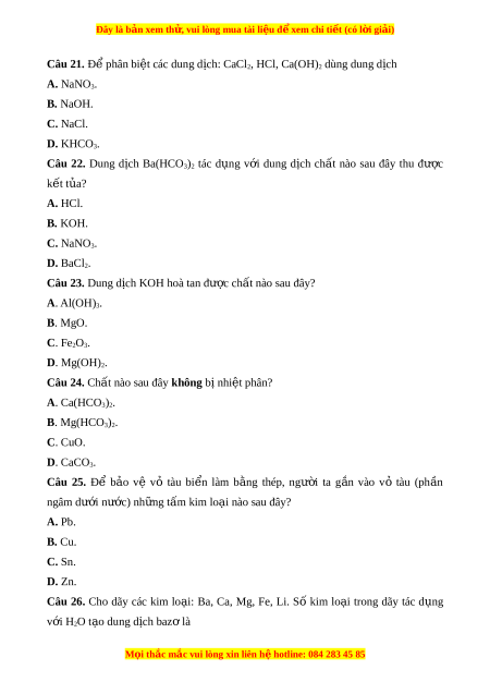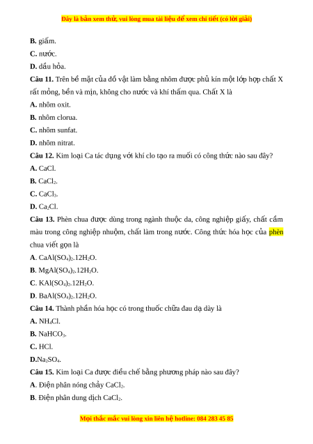 Đây là bản xem th , vu ử i lòng mua tài li u ệ đ xe ể m chi ti t ế (có l i ờ gi i ả ) B. giấm. C. nư c. ớ D. dầu h a. ỏ Câu 11. Trên bề m t ặ c a ủ đ ồ v t ậ làm b ng ằ nhôm đư c ợ ph kí ủ n m t ộ l p ớ h p ợ ch t ấ X rất m ng, b ỏ n và m ề ịn, không cho nư c và ớ khí th m ấ qua. Ch t ấ X là A. nhôm oxit. B. nhôm clorua. C. nhôm sunfat. D. nhôm nitrat. Câu 12. Kim lo i ạ Ca tác d ng ụ v i ớ khí clo t o r ạ a mu i ố có công th c nào s ứ au đây? A. CaCl. B. CaCl2. C. CaCl3. D. Ca2Cl.