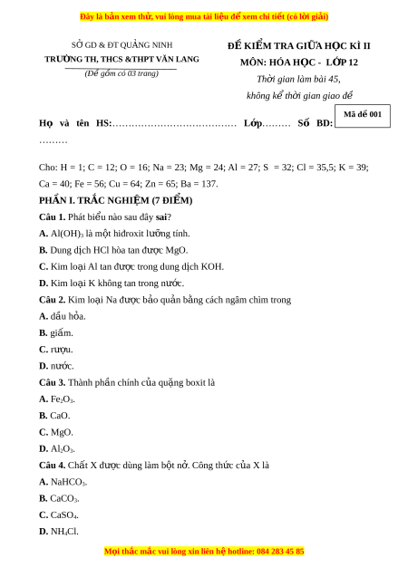Ờ G TH, THCS &THPT VĂN LANG MÔN: HÓA H C Ọ - L P Ớ 12 (Đề g m ồ có 03 trang) Th i ờ gian làm bài 45, không k t ể h i ờ gian giao đề Mã đ 001 ề