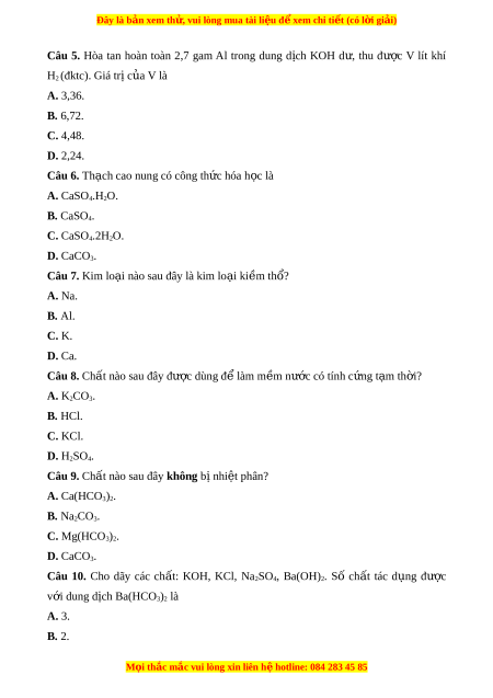 Câu 5. Hòa tan hoàn toàn 2,7 gam Al trong dung d ch ị KOH d , ư thu đư c ợ V lít khí H2 (đktc). Giá tr c ị a ủ V là A. 3,36. B. 6,72. C. 4,48. D. 2,24. Câu 6. Th ch cao ạ nung có công th c hóa ứ h c l ọ à A. CaSO4.H2O. B. CaSO4. C. CaSO4.2H2O. D. CaCO3. Câu 7. Kim lo i