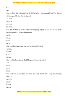 Câu 13. Công th c chung c ứ a ủ oxit kim lo i ạ nhóm IIA là A. R2O3. B. RO2. C. R2O. D. RO. Câu 14. Kim lo i