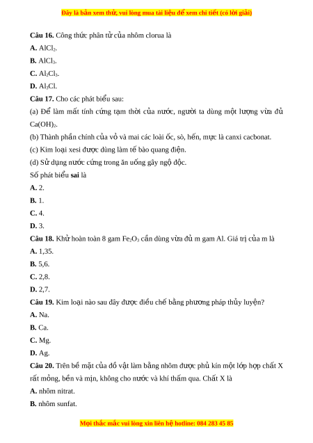 Câu 18. Khử hoàn toàn 8 gam Fe2O3 cần dùng v a đ ừ m ủ gam Al. Giá tr c ị a m ủ là A. 1,35. B. 5,6. C. 2,8. D. 2,7. Câu 19. Kim lo i ạ nào sau đây đư c đi ợ u ch ề ế b ng ph ằ ư ng pháp ơ th y l ủ uy n? ệ A. Na. B. Ca. C. Mg. D. Ag. Câu 20. Trên b ề m t ặ c a ủ đ ồ v t ậ làm b ng ằ nhôm đư c ợ ph kí ủ n m t ộ l p ớ h p ợ ch t ấ X rất m ng, b ỏ n và m ề ịn, không cho nư c và ớ khí th m ấ qua. Ch t ấ X là A. nhôm nitrat. B. nhôm sunfat. M i ọ thắc m c