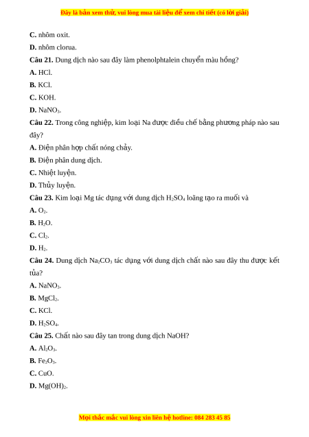 B. Dung dịch HCl hòa tan được MgO. C. Kim lo i ạ Al tan đư c t ợ rong dung d ch K ị OH. D. Kim lo i ạ K không tan trong nư c. ớ Câu 2. Kim lo i ạ Na đư c b ợ o ả qu n b ả ng ằ cách ngâm chìm trong A. dầu h a. ỏ B. giấm. C. rư u. ợ D. nư c. ớ