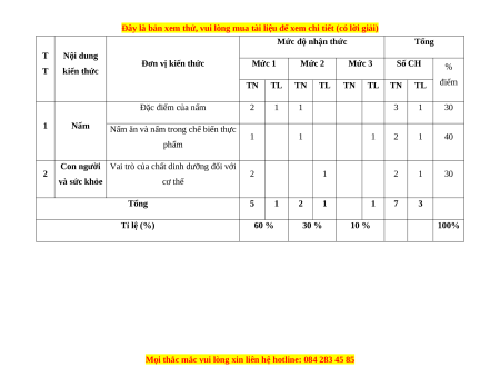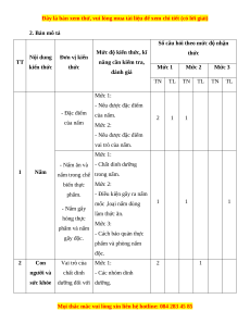 Đơn vị kiến thức Mức 1 Mức 2 Mức 3 Số CH T kiến thức % điểm TN TL TN TL TN TL TN TL Đặc điểm của nấm 2 1 1 3 1 30 1 Nấm