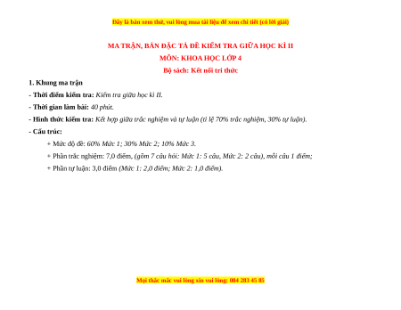 - Tailieugiaovien.com.vn giới thiệu 2 đề giữa kì 2 gồm đầy đủ ma trận và lời giải chi tiết môn Khoa học lớp 4 Kết nối tri thức mới nhất năm 2023 nhằm giúp Giáo viên có thêm tài liệu tham khảo ra đề thi Khoa học lớp 4.