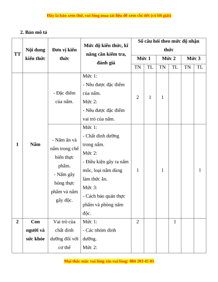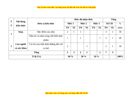 Đơn vị kiến thức Mức 1 Mức 2 Mức 3 Số CH % T kiến thức TN TL TN TL TN TL TN TL điểm Nấm Đặc điểm của nấm 2 1 1 3 1 30 1