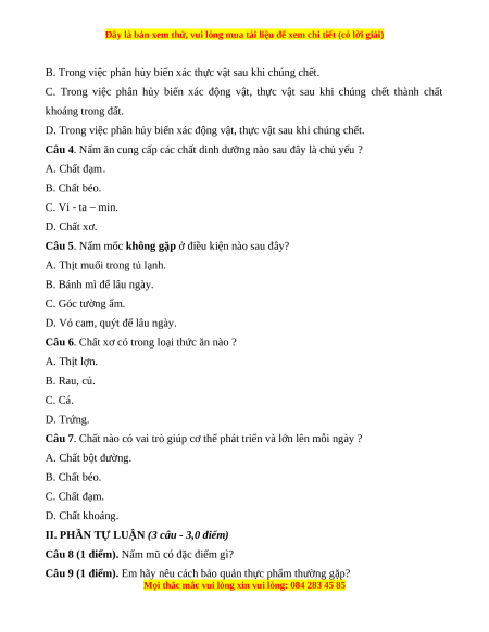 Câu 1. Nấm ít được tìm thấy nhất ở nơi nào sau đây? A. Gỗ mục. B. Lá cây mục. C. Lá cây xanh.