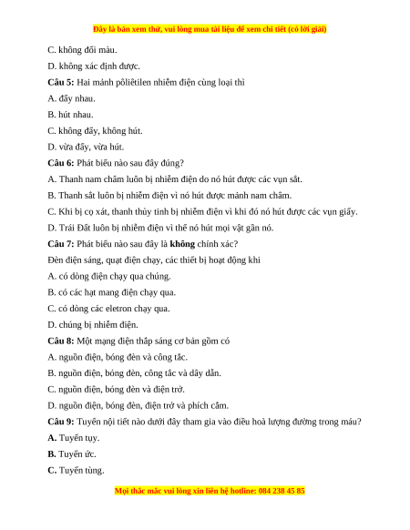 Câu 4: Dung dịch có giá trị pH = 7 sẽ làm giấy quỳ tím A. chuyển sang màu đỏ. B. chuyển sang màu xanh.