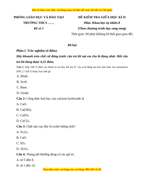 Câu 1: Hợp chất X được tạo thành từ sự thay thế ion H+ của acid bằng ion kim loại hoặc ion ammonium (NH +